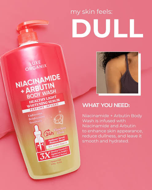 Niacinamide has brightening and skin-soothing properties that helps even out skin tone and minimize pore appearance. This ingredient delivers a flawless and sleek-looking complexion while also providing added hydration to avoid dry and flaky skin. Arbutin is a natural skin brightener that aids on diminishing dark spots and pigmentation. It is a gentle and skin-friendly ingredient that also enhances the overall luminous glow of the skin. The dynamic duo of Vitamins C and E, as antioxidants, protects skin against premature skin aging and provides UV protection, keeping your skin fresh, vibrant, and youthful. Discover the secret to flawless, glowing skin with Luxe Organix Niacinamide + Arbutin Body Wash Healthy Light Whitening Serum. This serum-body wash is enriched with Niacinamide and Arbutin that help brighten and improve the appearance of skin for a smooth and velvety shine, providing 24 hours of flawless glow. Also formulated with Vitamin C, Hyaluronic acid, and Vitamin E that brightens, soothes and revitalizes dull-looking skin. Embrace this serum-body wash as it pampers your skin, leaving it smooth, refreshed, and beautifully glowy